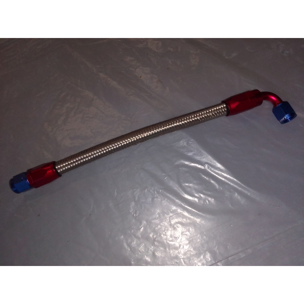 RVS omvlochten leiding met rood/zwarte koppelingen.
